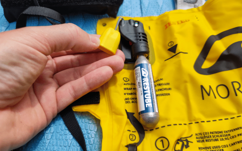 1. Prepare the Swim Buoy: Begin by taking the Restube Beach out of its storage bag and screw in the provided CO² cartridge (10.9 g) into the trigger mechanism. Ensure that the color indicator turns green once properly installed.