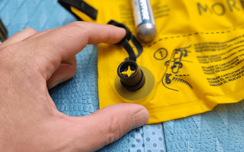 3. Inflate the Swim Buoy: To inflate the Restube Beach, pull firmly on the trigger mechanism in case of an emergency or simply need the swim buoy support during your water activities. This will cause it to inflate automatically in just a few seconds, thanks to the CO² cartridge.