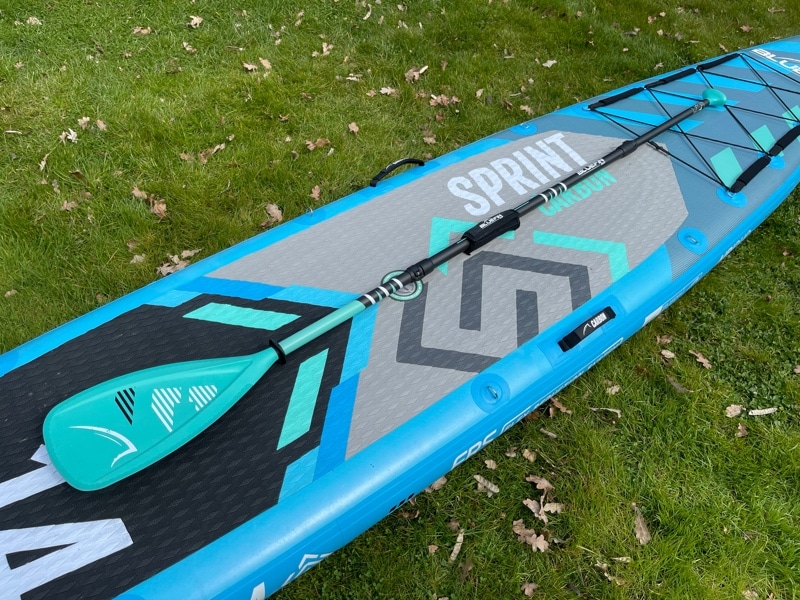 - 3-piece Bluefin Sprint Carbon Paddle: This adjustable paddle (170 cm to 220 cm) is made with a carbon shaft and sturdy PU (polyurethane) blade and handle. It offers lightweight performance and enhanced durability compared to other options.