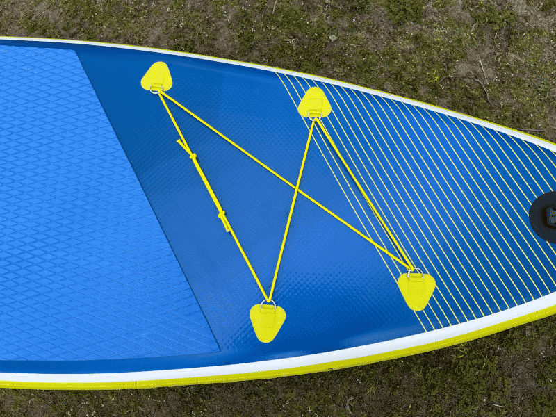 - Cargo Net: Towards the nose of the board, a yellow, elastic deck net is stretched diagonally across 4 additional D-rings. The attachment rings are reinforced with triangular PVC patches. If you pack your belongings in a waterproof dry bag, you can securely store it here.