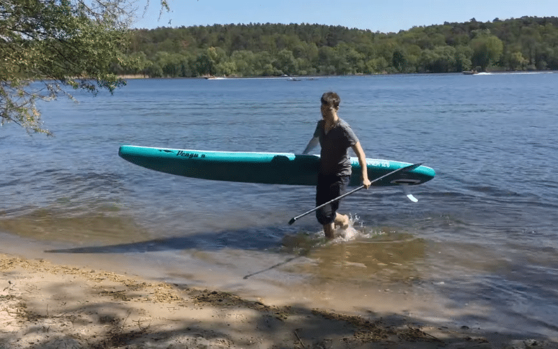 The board’s design and riding characteristics make it ideal for long-distance paddling on calm waters.