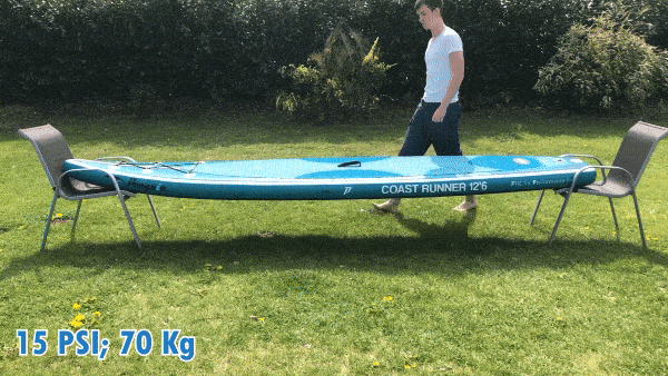 Inflate the Penguin Coast Runner to a recommended pressure of 15 PSI for optimal rigidity and performance.